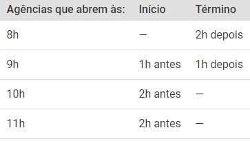 Aquelas que abrem às 8h funcionarão por duas horas extras e aquelas que abrem às 9h iniciarão uma hora antes e terminarão uma hora depois. Já aquelas que abrem às 10h e às 11h vão abrir duas horas antes.