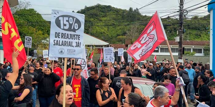 Durante o protesto, os serviços municipais param parcialmente, exceto emergências de saúde. A categoria denuncia atraso nas negociações da Campanha Salarial 2025.