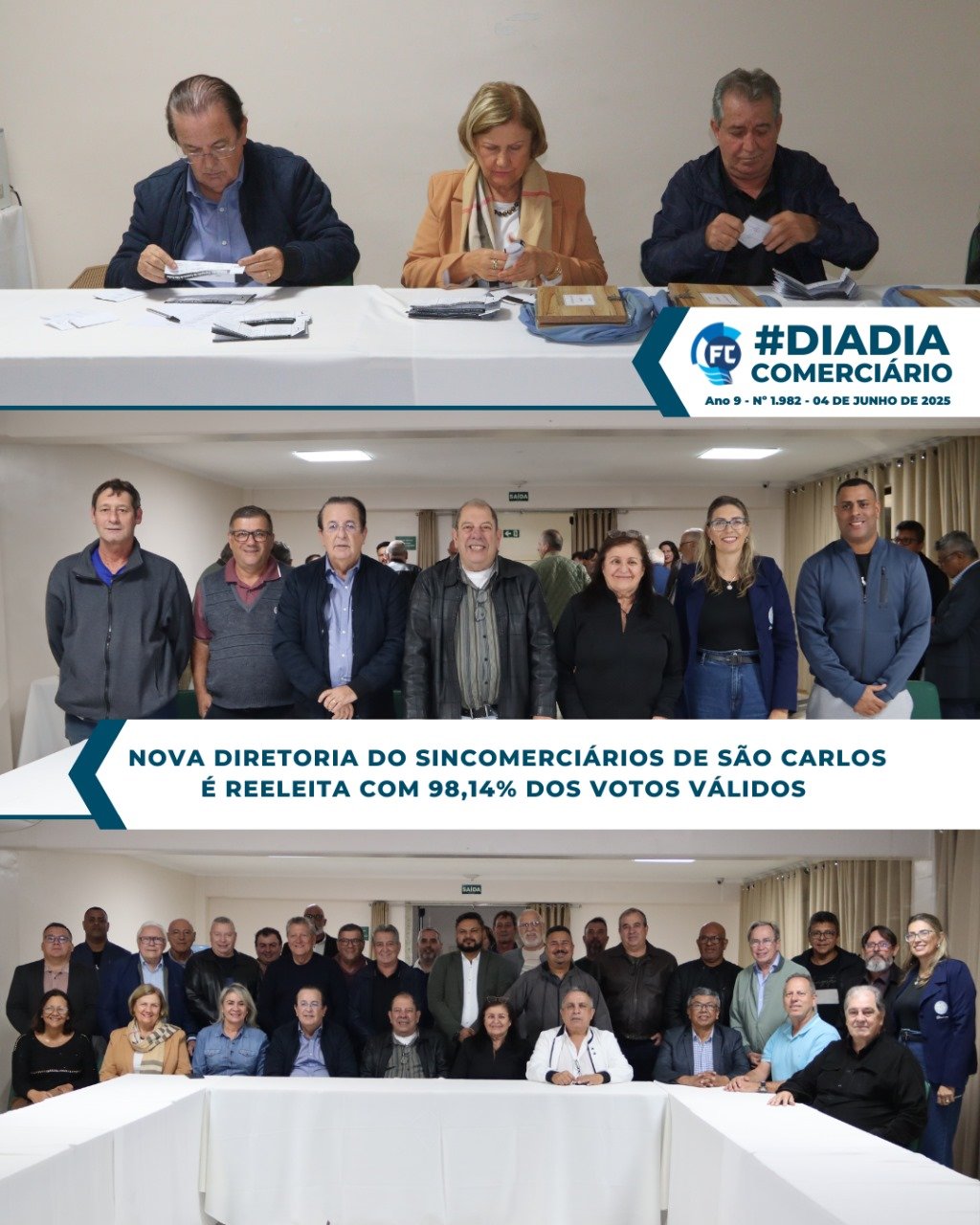 A nova Diretoria do Sincomerciários de São Carlos foi reeleita com 98,14% dos votos válidos, nas eleições realizadas nos dias 28 e 29 de maio, com uma urna fixa (na sede da entidade) e cinco itinerantes.