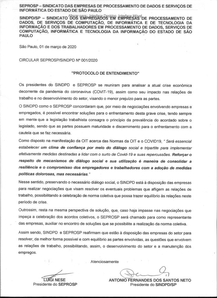 O Sindpd e o sindicato patronal correspondente, Seprosp, divulgaram circular conjunta estimulando as empresas do setor de Tecnologia da Informação a firmarem instrumentos coletivos para se adequar às necessidades desse período, garantindo assim a legalidade necessária para acessar os benefícios fiscais da MP 936 e para evitar transtornos futuros no judiciário.