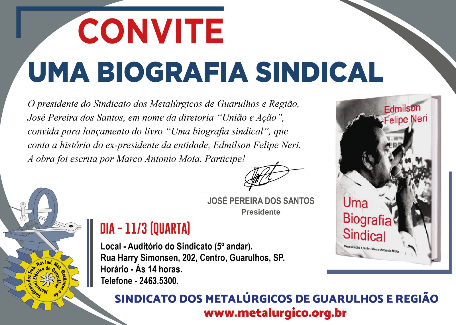O Sindicato dos Metalúrgicos de Guarulhos e Região lança o livro “Uma biografia sindical”, com a história do ex-presidente, Edmilson Felipe Neri. Nesta quarta (11), às 14 horas, na sede, à rua Harry Simonsen, 202, Centro, Guarulhos.