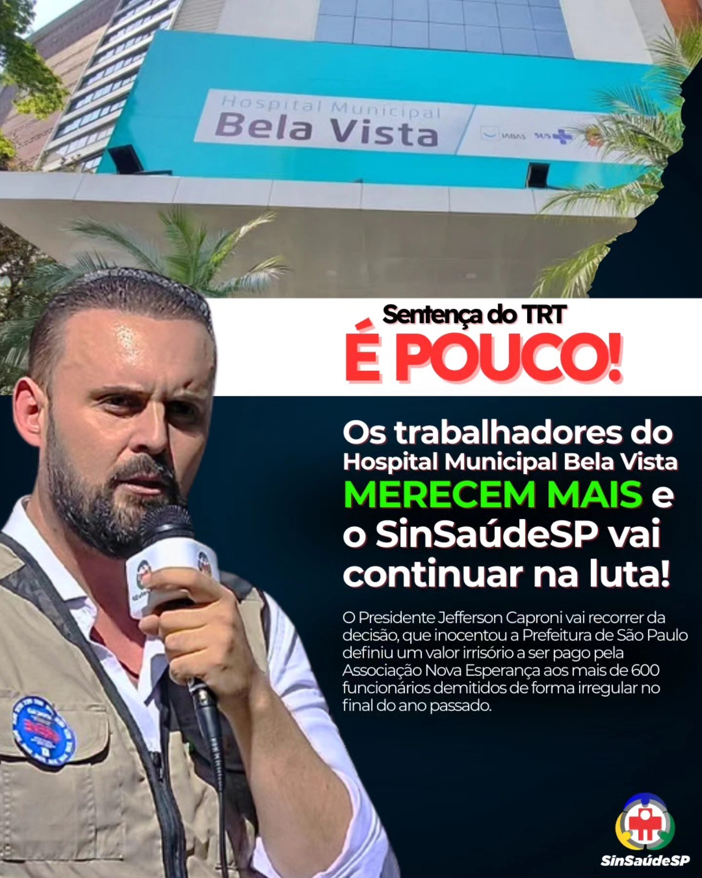 O Sindicato da Saúde de São Paulo (SinSaúdeSP) anunciou que vai recorrer da decisão da 24ª Vara do Trabalho de São Paulo no caso das demissões no Hospital Municipal Bela Vista. A sentença inocentou a Prefeitura de São Paulo de responsabilidade e determinou que a Associação Filantrópica Nova Esperança pague a cada trabalhador apenas um salário e três cestas básicas, com teto de R$ 2.000,00 por pessoa.