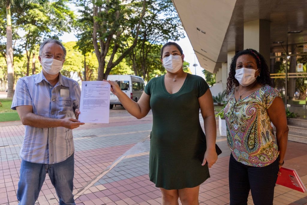 Priscila Guedes e Aparecida Góes entregam ofício contendo a resposta dos servidores ao chefe de gabinete, Clóvis Augusto de Melo (05/04/21) – Foto: Phill Natal/SISMMAR