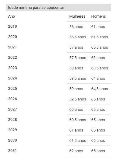 Na transição com idade mínima, os trabalhadores precisarão completar, ainda neste ano, 56 anos, para mulheres, e 61 para homens. Essa exigência vai a 56 anos e seis meses e 61 anos e seis meses em 2020 e seguirá subindo até atingir o patamar da nova regra geral.
