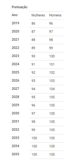 No caso da regra de pontos, a soma mínima passa a ser 87, para mulheres, e 97, para homens, já no ano que vem.