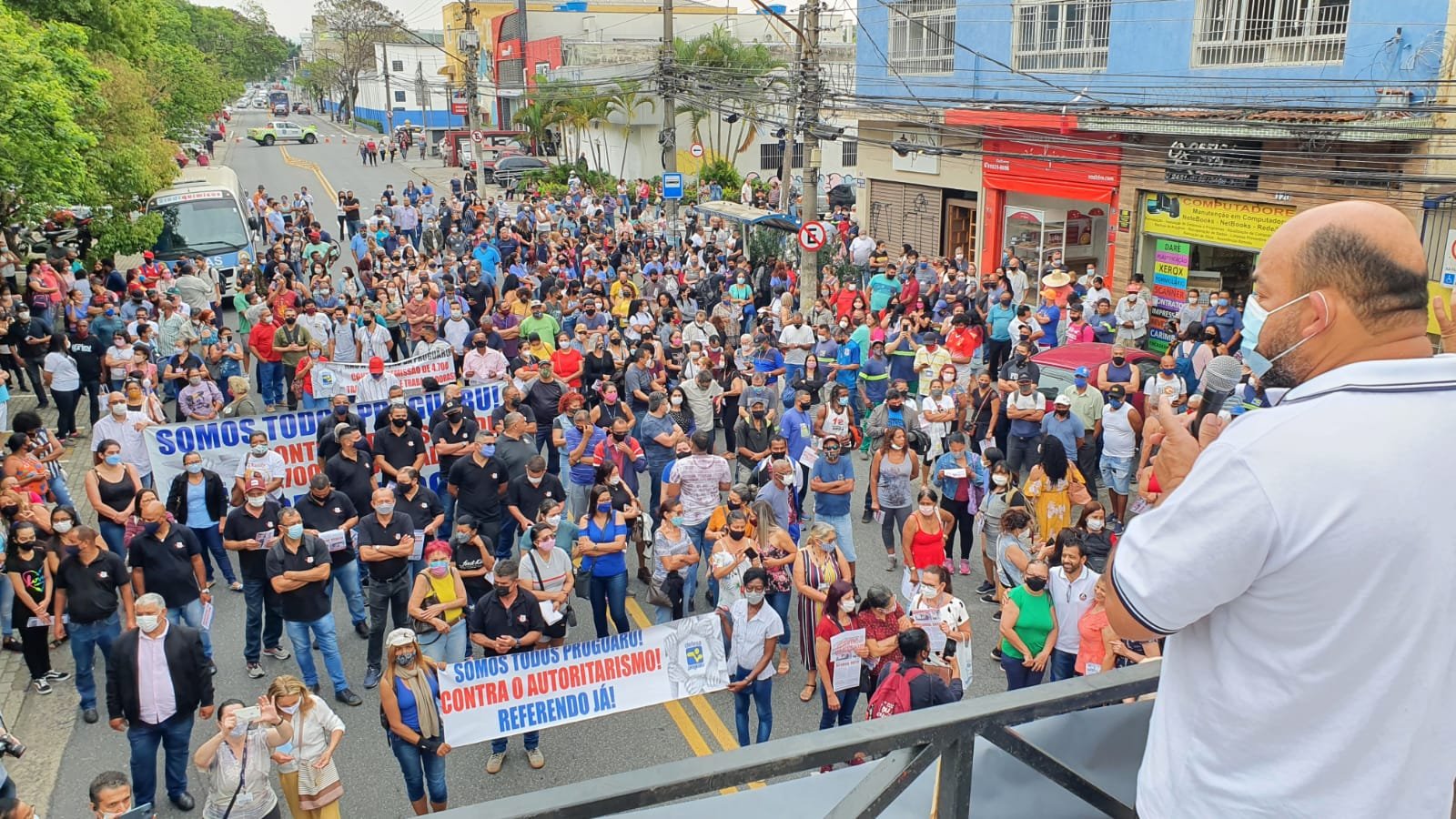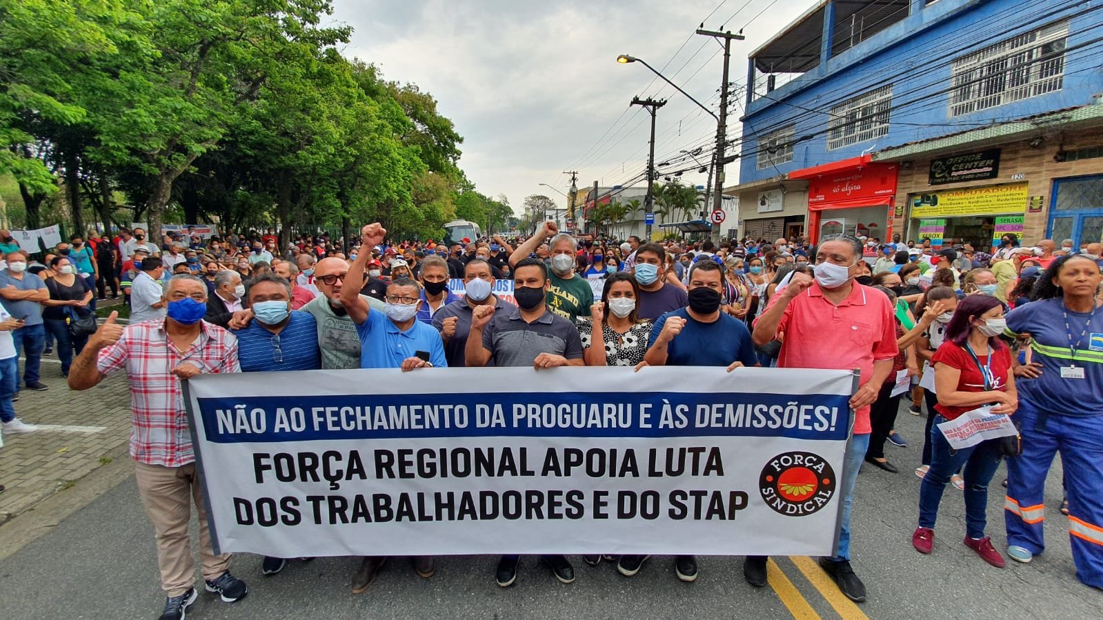 Em defesa do emprego e da continuidade da Proguaru (Progresso e Desenvolvimento de Guarulhos S.A.) , mais de mil trabalhadores tomam a rua em frente ao Paço Municipal, à avenida Bom Clima, 90. Em assembleia, os companheiros decidem nesta manhã (15) se irão à greve.